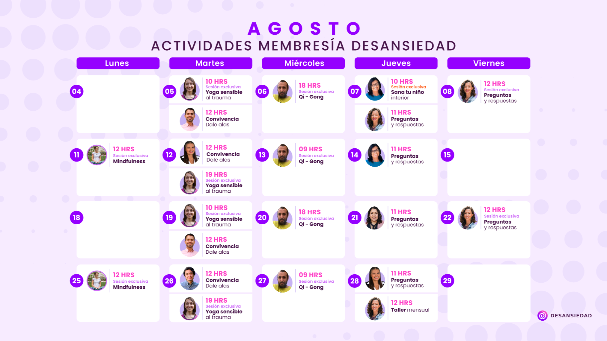 - Programas: Mindfulness Básico, Niño Interior, Revincúlate con tu Sistema Nervioso, Descansa con Desansiedad